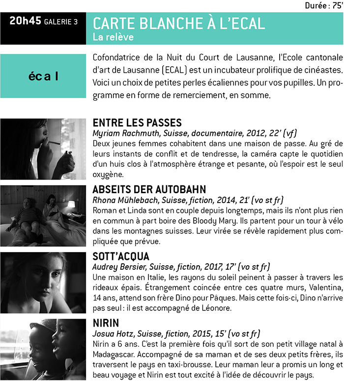 Le programme détaillé de la 20e Nuit du Court de Lausanne en PDF est téléchargeable ici.